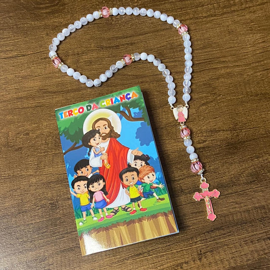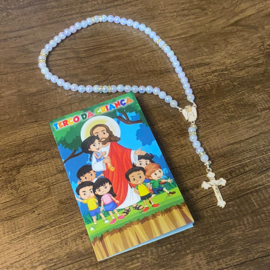 TERÇO PÉROLA COM STRASS ANJO DA GUARDA BRANCO 08MM (1 UNIDADE)