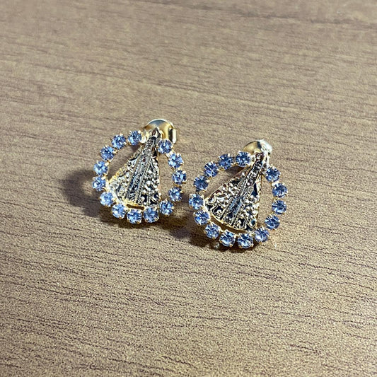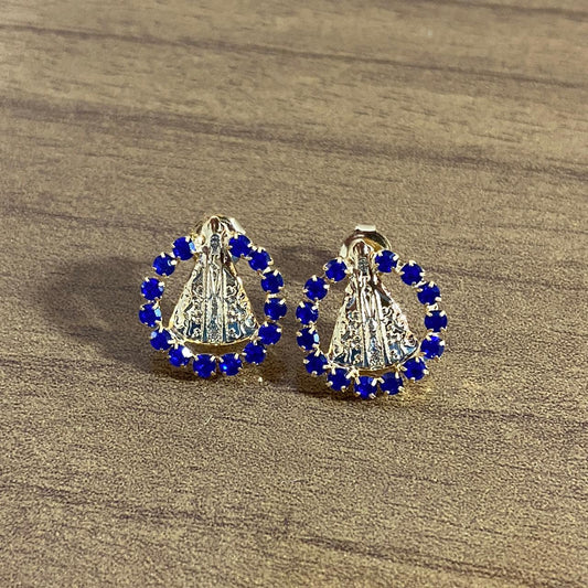 PAR BRINCOS DOURADOS NOSSA SENHORA APARECIDA COM STRASS AZUL (1 UNIDADE)