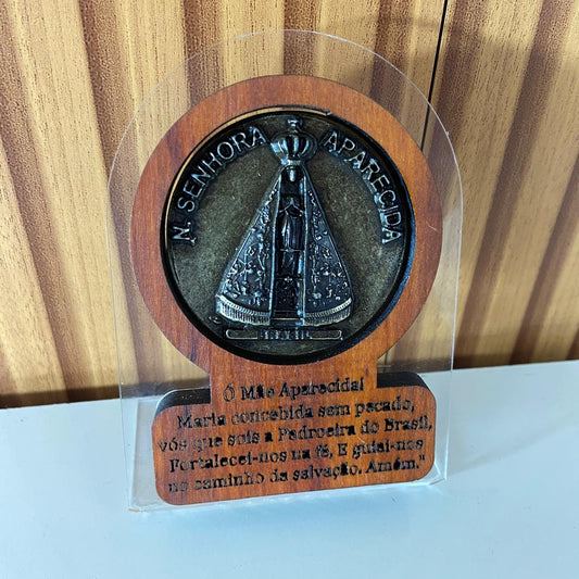 ADORNO DE MESA ACRÍLICO E MADEIRA COM ORAÇÃO NOSSA SENHORA APARECIDA METAL OURO VELHO 12CM (1 UNIDADE)