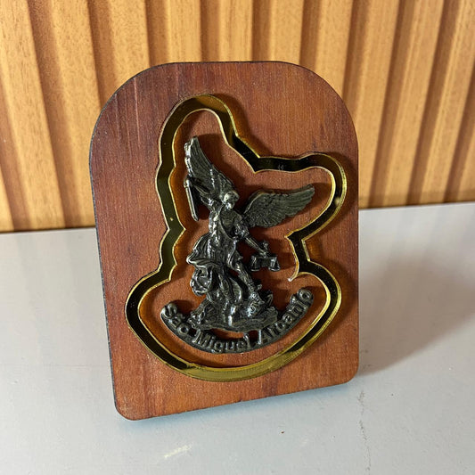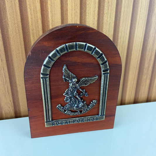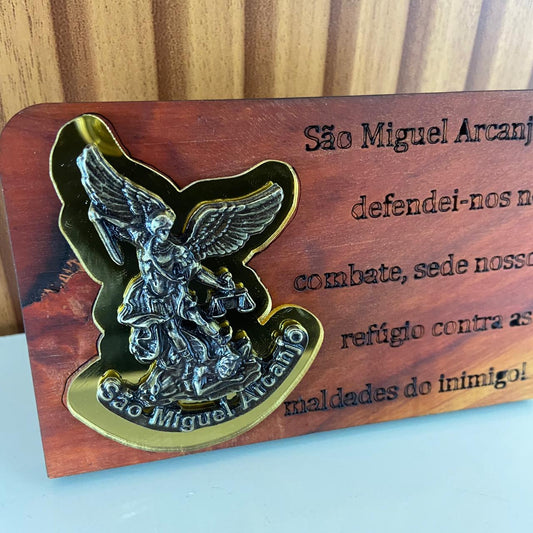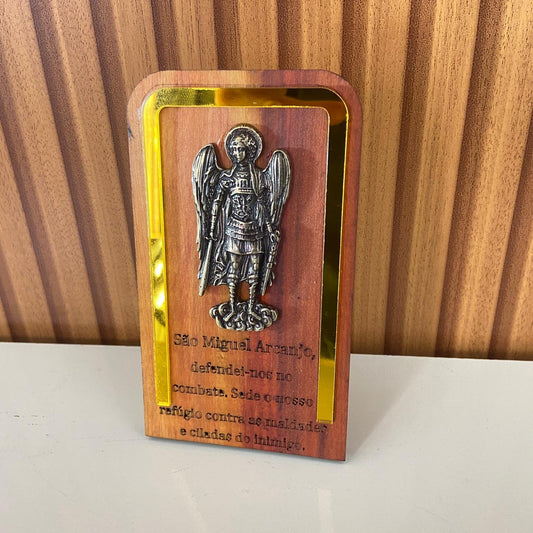 ADORNO DE MESA MADEIRA COM ORAÇÃO SÃO MIGUEL ARCANJO METAL OURO VELHO 7,7CM (1 UNIDADE)