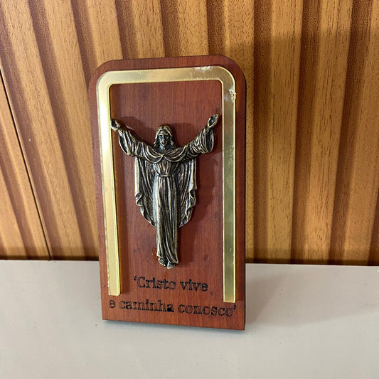ADORNO DE MESA MADEIRA COM ORAÇÃO JESUS RESSUSCITADO METAL OURO VELHO 13,5CM (1 UNIDADE)