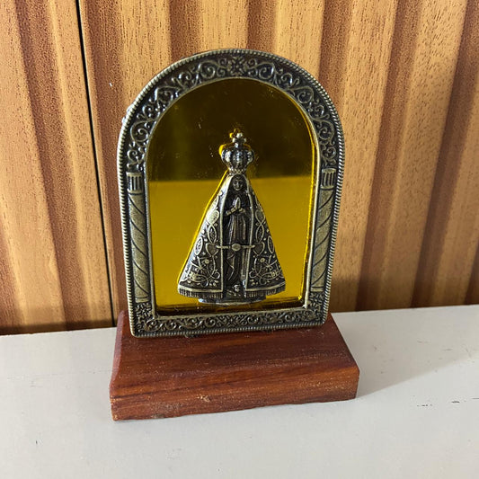 ADORNO DE MESA MADEIRA ESPELHADO NOSSA SENHORA APARECIDA METAL OURO VELHO 9,8CM (1 UNIDADE)