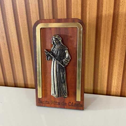 ADORNO DE MESA MADEIRA COM SANTA RITA DE CÁSSIA METAL OURO VELHO 13,5CM (1 UNIDADE)