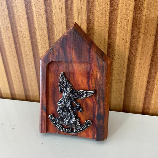 ADORNO DE MESA MADEIRA SÃO MIGUEL ARCANJO DE METAL COM ACRÍLICO 10CM (1 UNIDADE)