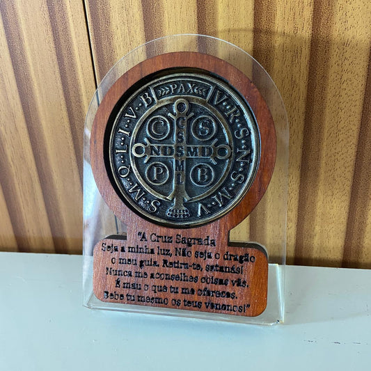 ADORNO DE MESA ACRÍLICO E MADEIRA COM ORAÇÃO MEDALHA SÃO BENTO METAL OURO VELHO 12CM (1 UNIDADE)