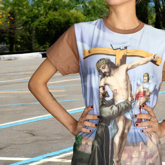CAMISETA MARROM CLARO SÃO FRANCISCO DE ASSIS COM JESUS NA CRUZ TAMANHO PP (1 UNIDADE)