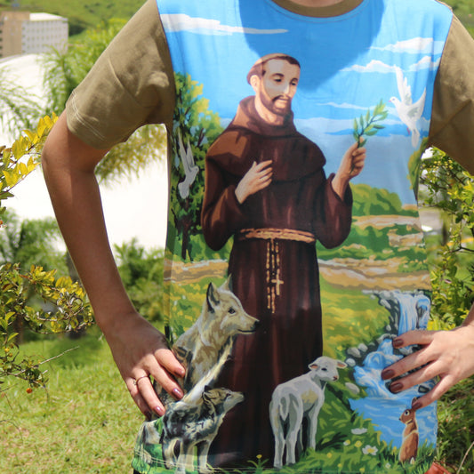 CAMISETA MARROM CLARO SÃO FRANCISCO DE ASSIS TAMANHO PP (1 UNIDADE)
