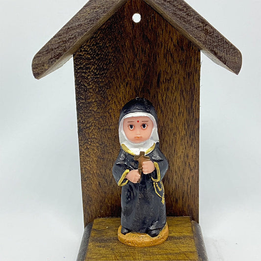KIT SANTA RITA DE DE CÁSSIA RESINA NACIONAL 8CM + ORATÓRIO DE MADEIRA PARA IMAGEM DE 10CM (1 UNIDADE)
