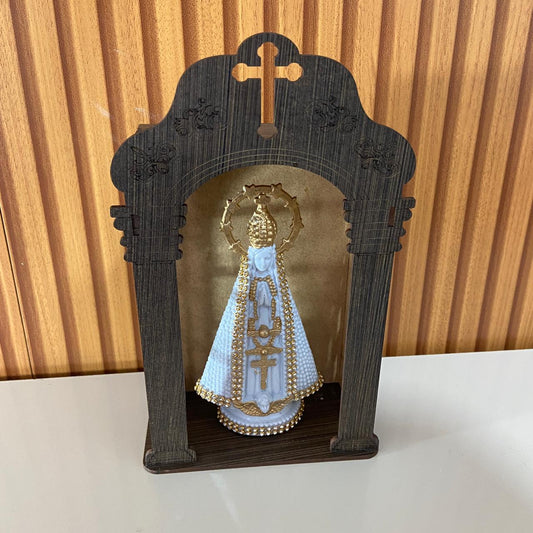 ORATÓRIO DE PAREDE E MESA MDF DOURADO+ IMAGEM DE PLÁSTICO NOSSA SENHORA APARECIDA BRANCA COM STRASS 15CM (1 UNIDADE)