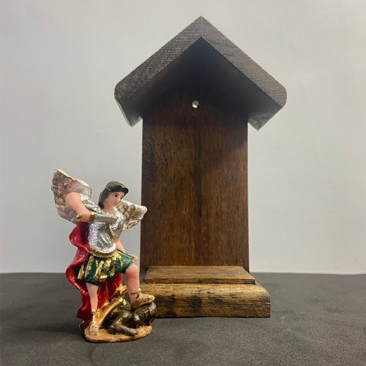 KIT SÃO MIGUEL DE RESINA NACIONAL 7CM + ORATÓRIO DE MADEIRA PARA IMAGEM DE 10CM (1 UNIDADE)