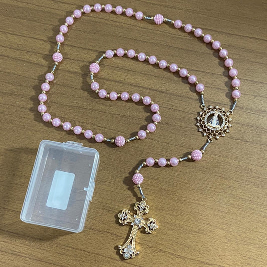 TERÇO DE NOIVA DOURADO PÉROLA ROSA NOSSA SENHORA APARECIDA 08MM MOD1 (1 UNIDADE)