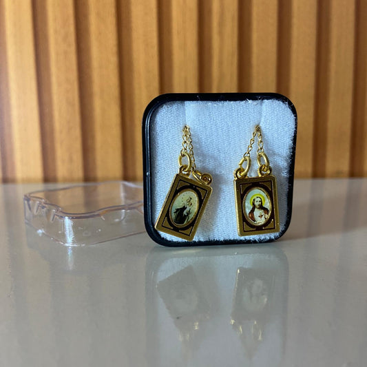 ESCAPULÁRIO DOURADO RESINADO SAGRADO CORAÇÃO DE JESUS E NOSSA SENHORA DO CARMO (1 UNIDADE)