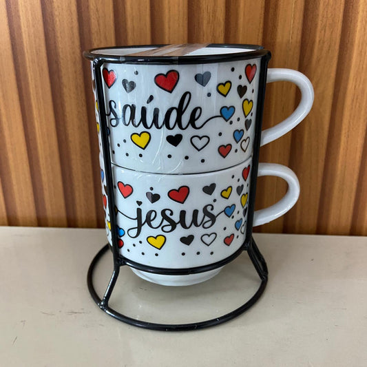 XÍCARA BRANCA EMPILHÁVEL SAÚDE E JESUS ( 2 UNIDADES)