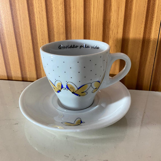 XÍCARA COM PIRES BORBOLETA AZUL E DOURADO 120ML (1 UNIDADE)