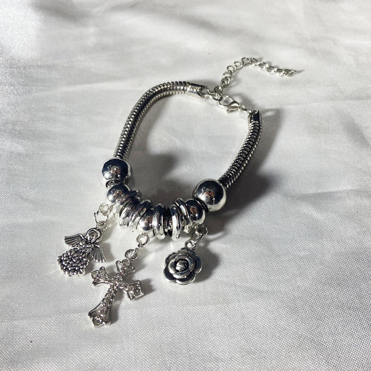 PULSEIRA PRATEADA CRUZ COM BERLOQUES (6 UNIDADES)