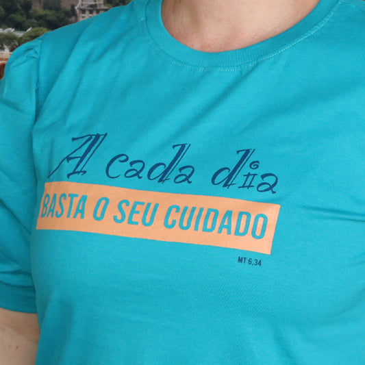 CAMISETA AZUL BASTA SEU CUIDADO MANGA BUFANTE TAMANHO M (1 UNIDADE)