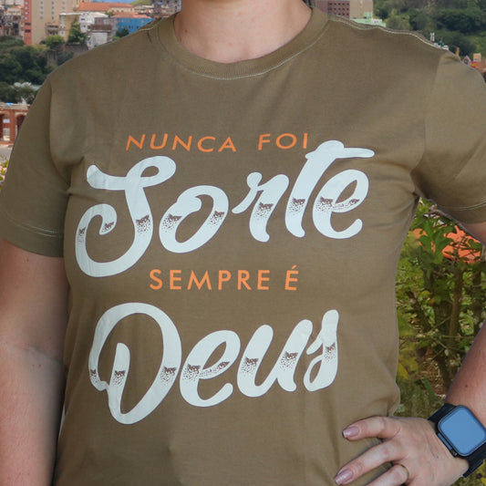 CAMISETA MARROM NUNCA FOI SORTE SEMPRE É DEUS TAMANHO PP (1 UNIDADE)