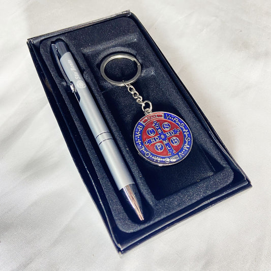 KIT CANETA COM CHAVEIRO MEDALHA SÃO BENTO PRATA ( 1 UNIDADE)