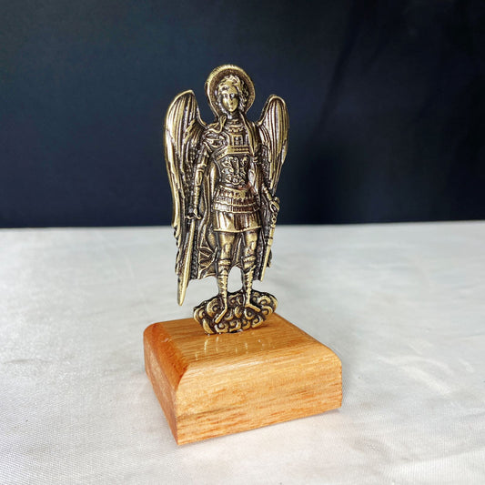 IMAGEM DE MESA METAL OURO VELHO SÃO MIGUEL ARCANJO COM BASE DE MADEIRA 09CM (1 UNIDADE)