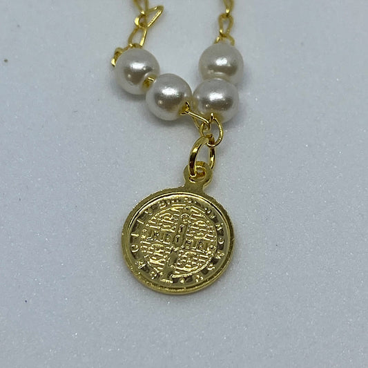 PULSEIRA DOURADA MEDALHA SÃO BENTO COM PÉROLAS (6 UNIDADES)