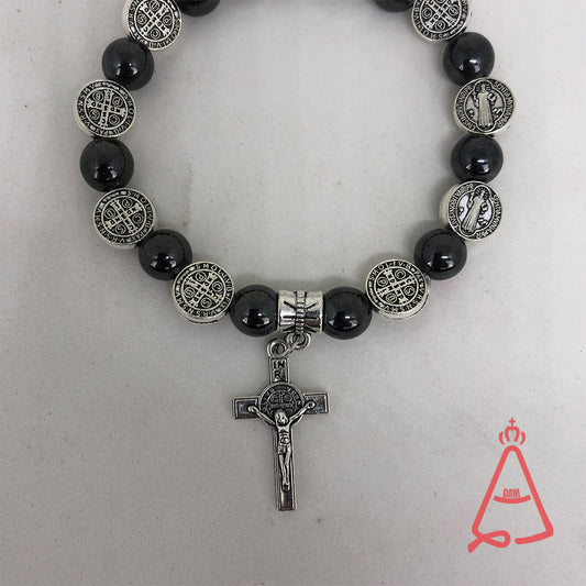 PULSEIRA HEMATITA MEDALHAS DECORADAS SÃO BENTO COM CRUCIFIXO (12 UNIDADES)