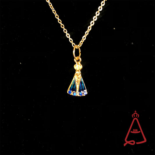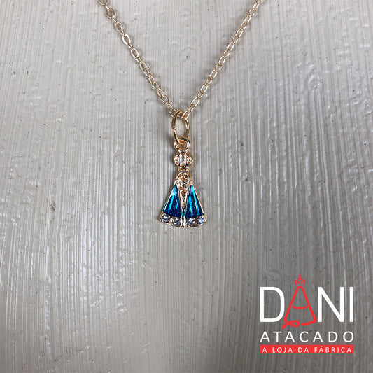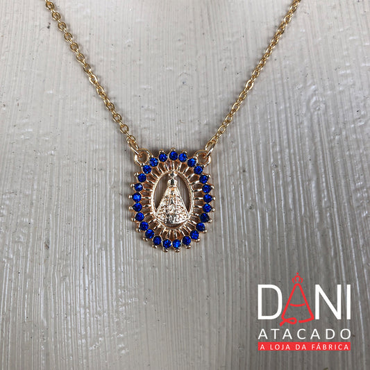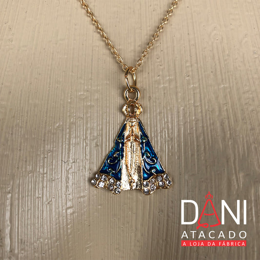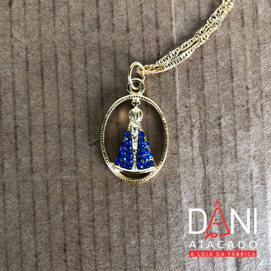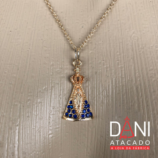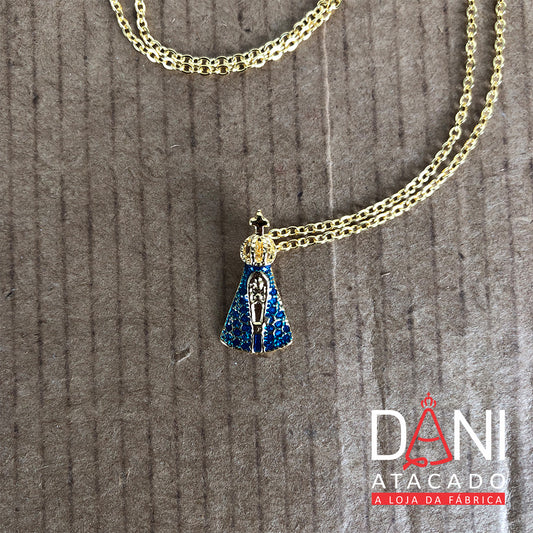 CORRENTE DOURADA NOSSA SENHORA APARECIDA CORPO PINTADO LISO MINI STRASS AZUL (1 UNIDADE)