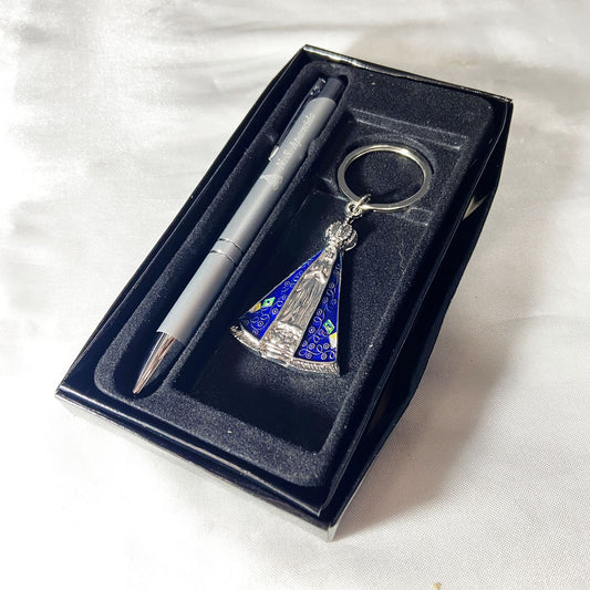 KIT CANETA COM CHAVEIRO NOSSA SENHORA APARECIDA PRATA ( 1 UNIDADE)