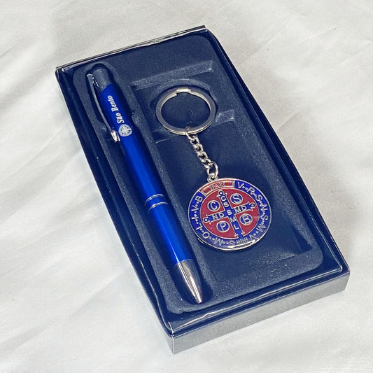 KIT CANETA COM CHAVEIRO MEDALHA SÃO BENTO AZUL ( 1 UNIDADE)