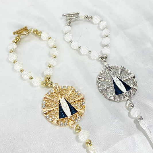 DEZENA PARA CARRO DOURADA E PRATEADA NOSSA SENHORA APARECIDA RAIADO AMORA BRANCA 10MM (3 UNIDADES)