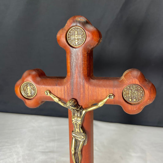 CRUCIFIXO MADEIRA DE MESA E PAREDE MEDALHA SÃO BENTO E NOSSA SENHORA DAS GRAÇAS 20CM (1 UNIDADE)
