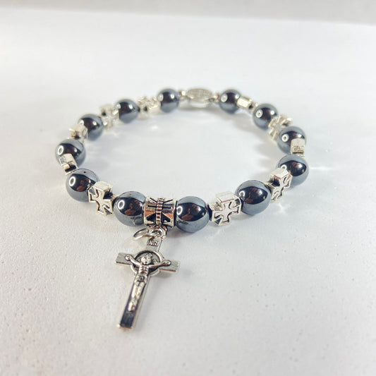 PULSEIRA HEMATITA CRUCIFIXO MEDALHA SÃO BENTO (12 UNIDADES)