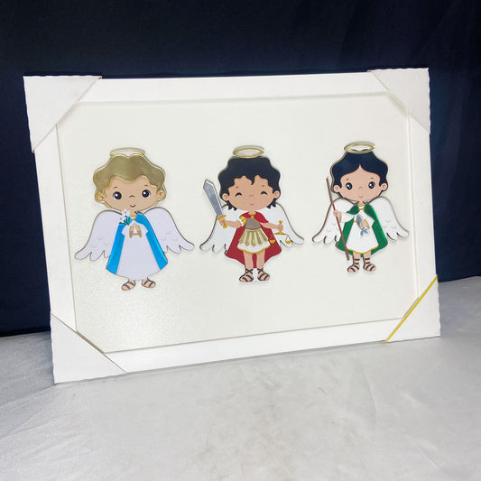 QUADRO MDF TRÊS ARCANJOS INFANTIL COM ACRÍLICO 24,5CMX34,5CM (1 UNIDADE)