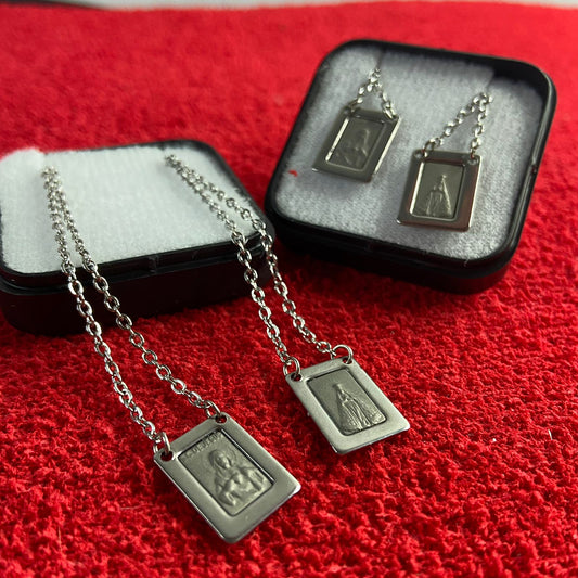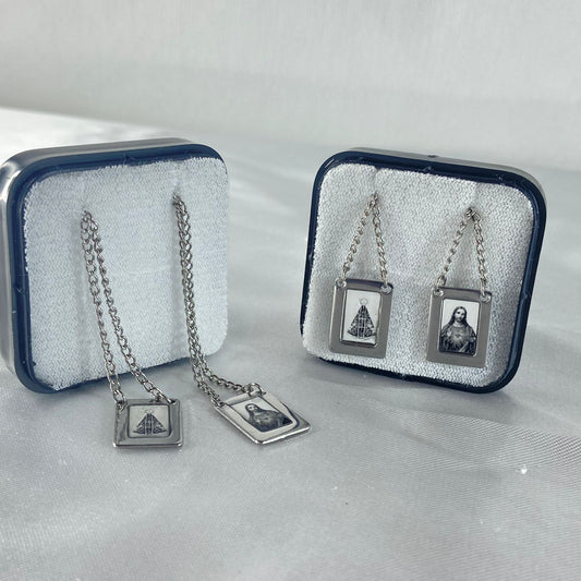 ESCAPULÁRIO INOX QUADRADO SAGRADO CORAÇÃO DE JESUS E NOSSA SENHORA APARECIDA (6 UNIDADES)