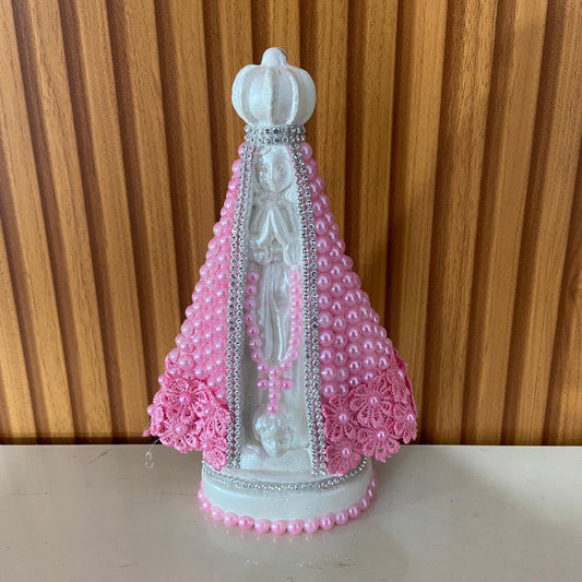 IMAGEM DE GESSO NOSSA SENHORA APARECIDA BRANCA BORDADA COM PÉROLA ROSA 22,5CM (1 UNIDADE)