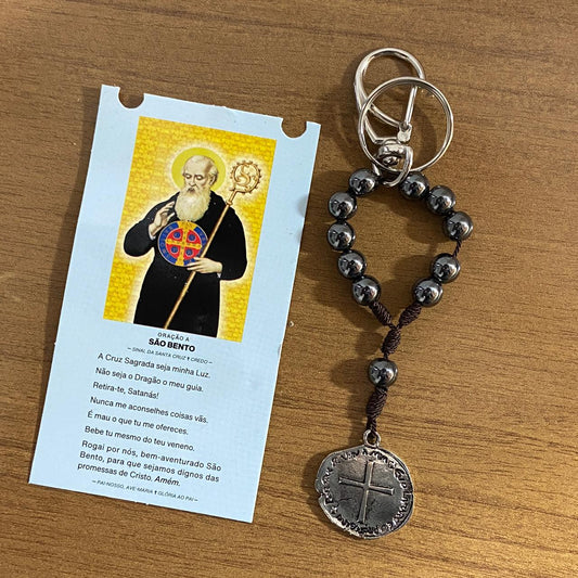 CHAVEIRO DEZENA HEMATITA COM MOSQUETE DUAS MEDALHAS (3 UNIDADES)