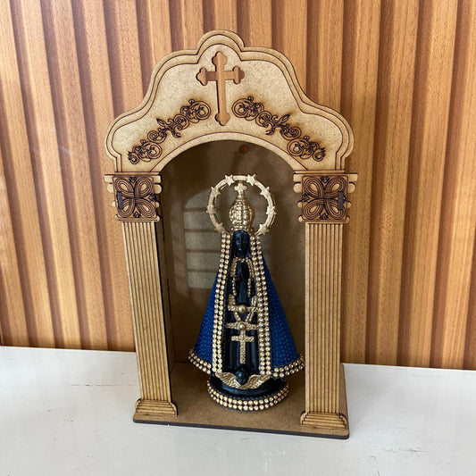 ORATÓRIO DE PAREDE E MESA MDF + IMAGEM DE PLÁSTICO NOSSA SENHORA APARECIDA AZUL COM STRASS 15CM (1 UNIDADE)