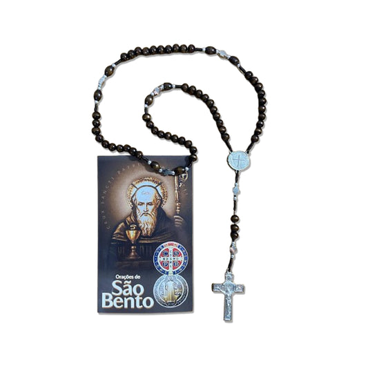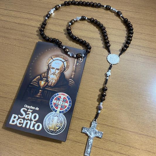 TERÇO DE MADEIRA NOSSA SENHORA APARECIDA E MEDALHA SÃO BENTO 8MM (3 UNIDADES)