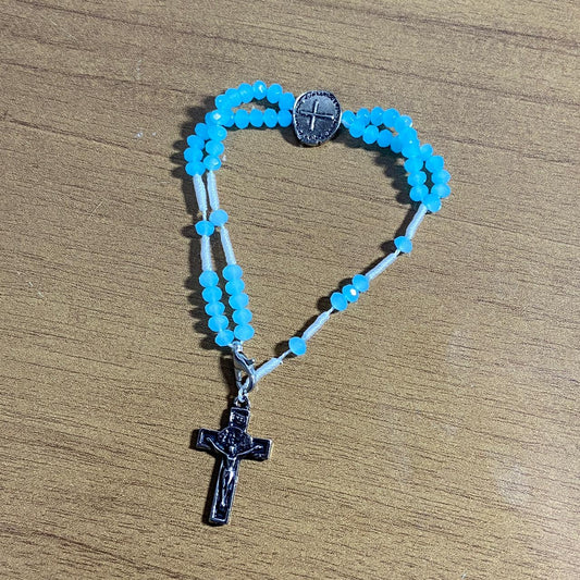 TERÇO PULSEIRA CRISTAL DUAS MEDALHAS AZUL BEBÊ (3 UNIDADES)