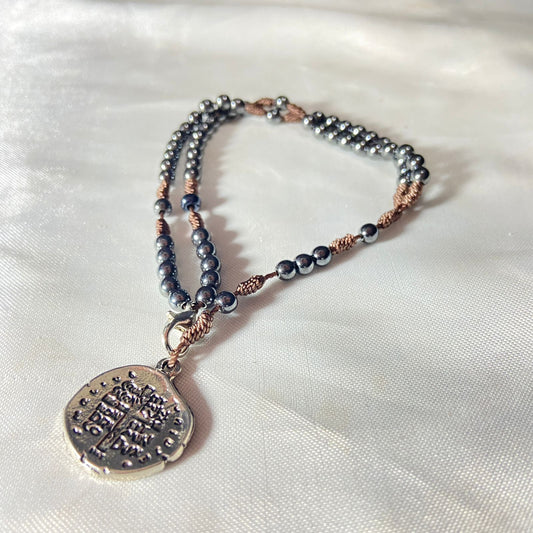 TERÇO PULSEIRA HEMATITA DUAS MEDALHAS 4MM (6 UNIDADES)