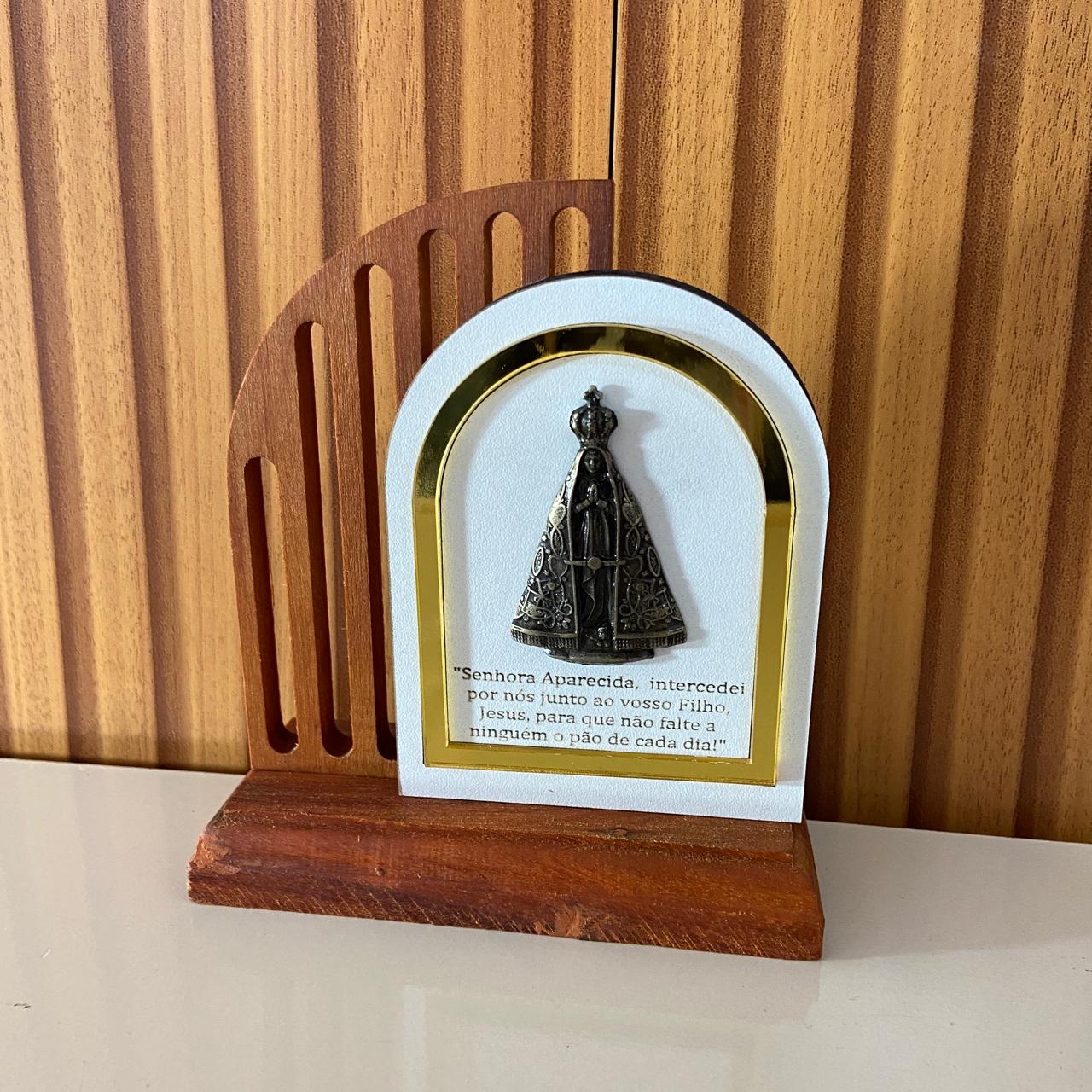 ADORNO DE MESA MADEIRA NOSSA SENHORA APARECIDA DE METAL COM ORAÇÃO 14CM(1 UNIDADE)