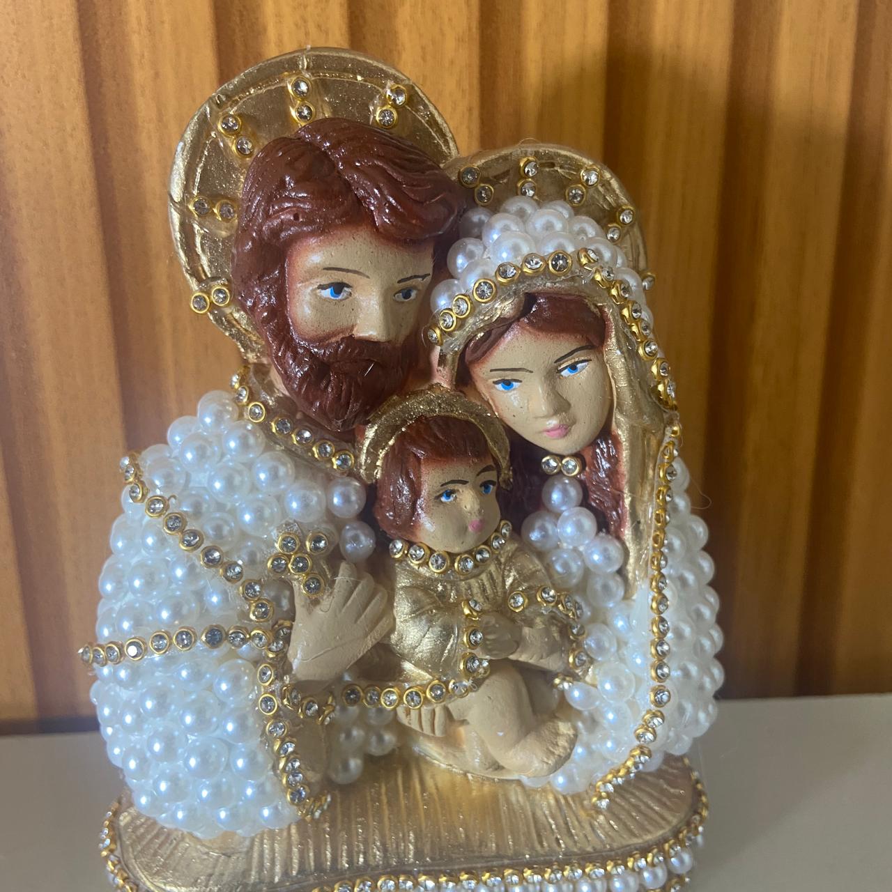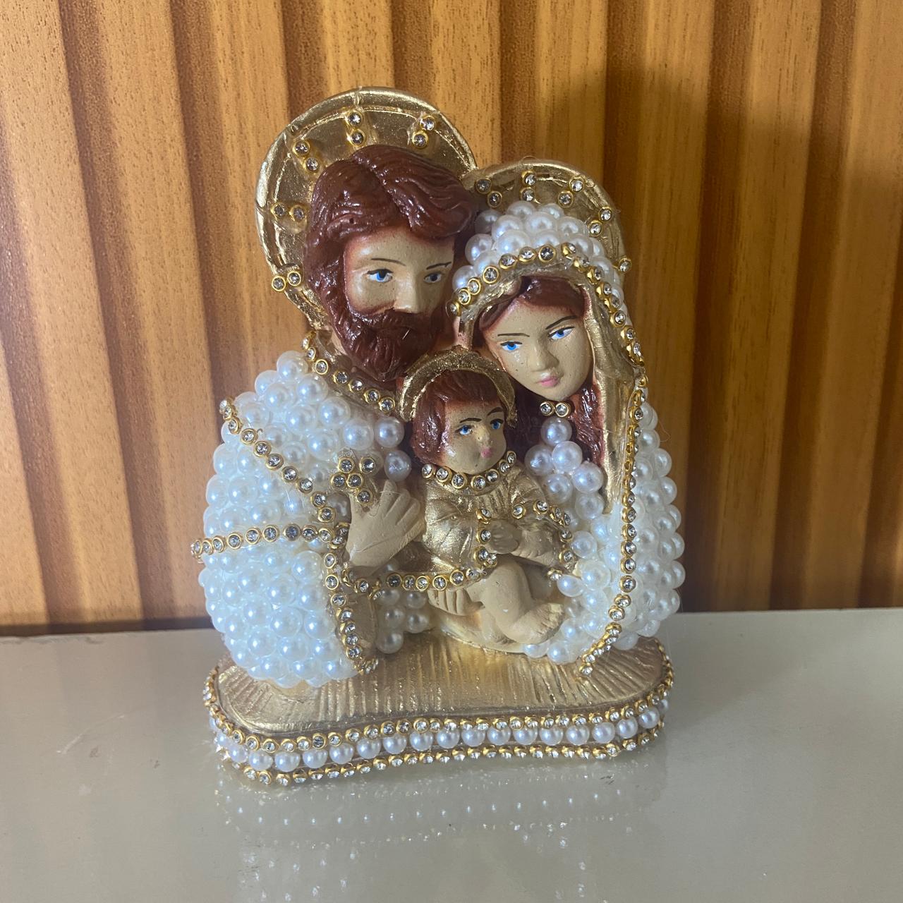 BUSTO DE GESSO SAGRADA FAMÍLIA BRANCO E DOURADO COM PÉROLA E STRASS 13CM MOD 1 (1 UNIDADE)