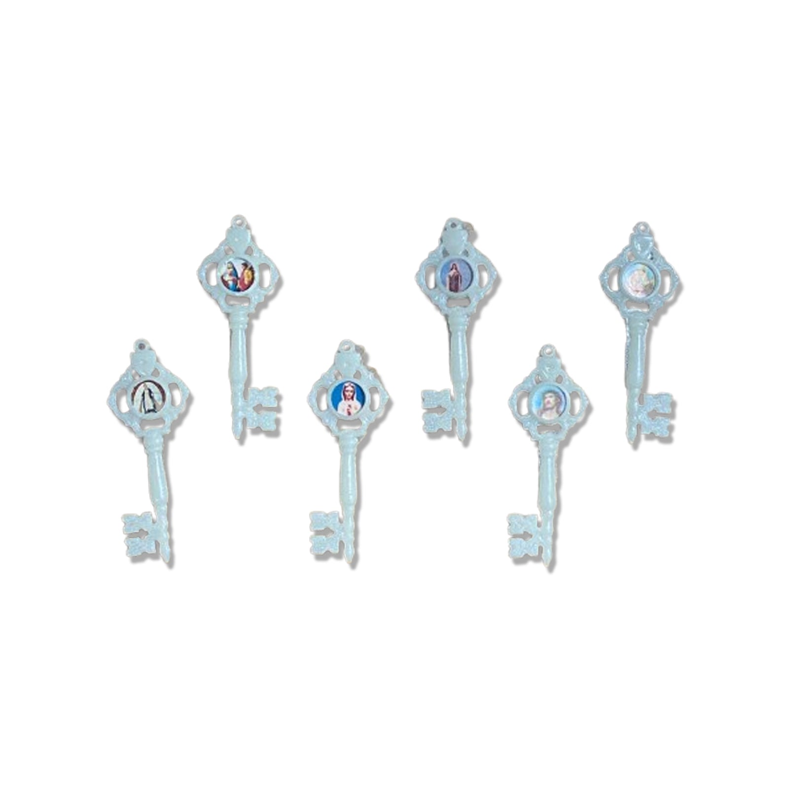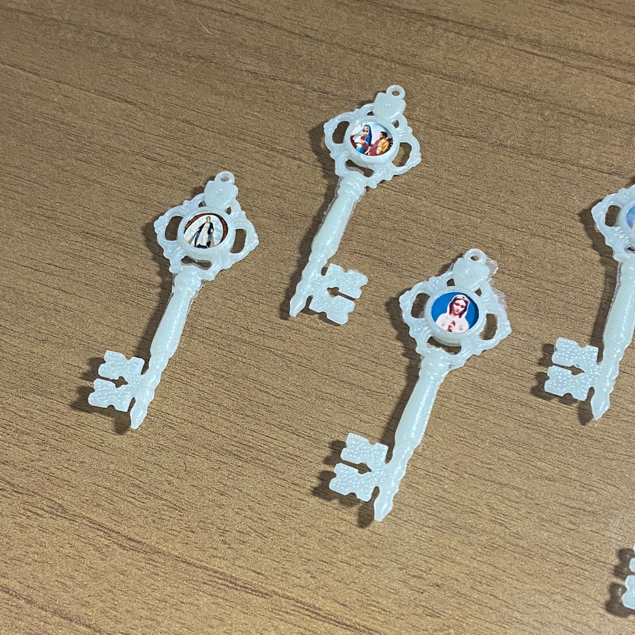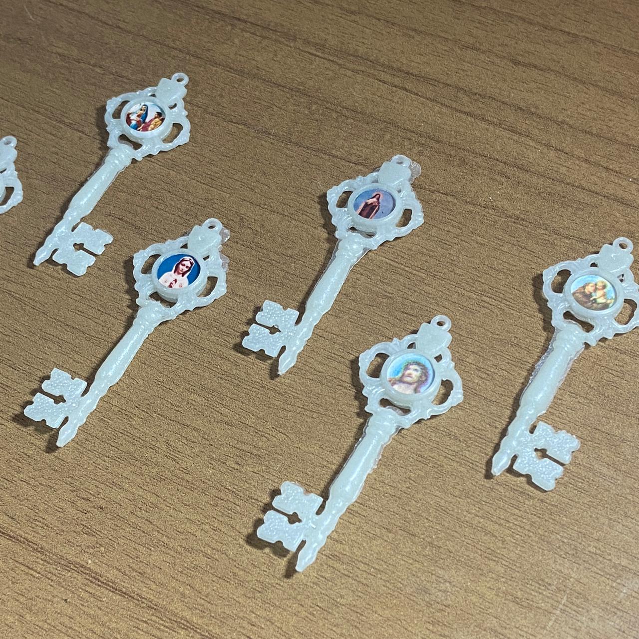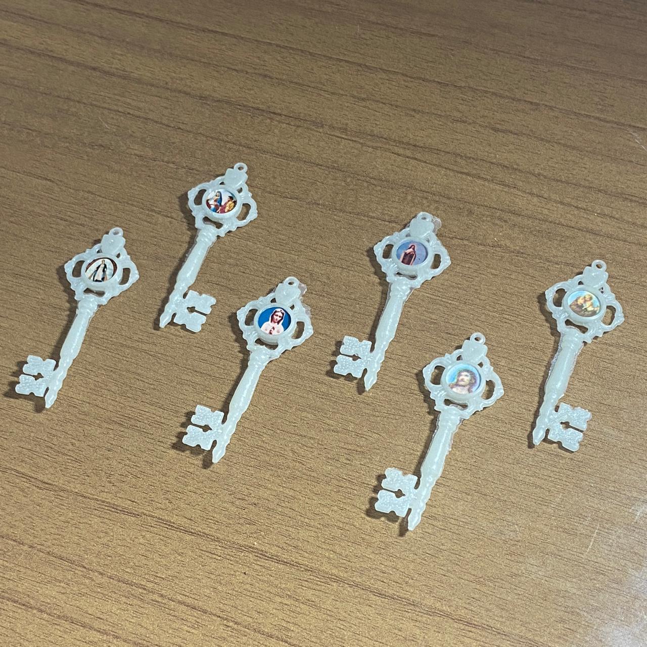 As chaves pícolas são pequenos símbolos de fé cristã, geralmente feitas de plástico com acabamento simples, mas de profundo significado espiritual. Decoradas com imagens de santos católicos, como Santo Expedito, Nossa Senhora Aparecida ou São José, essas chavinhas são populares entre fiéis que buscam proteção, abertura de caminhos e bênçãos no lar ou no trabalho. Muito usadas como lembrancinhas de festas religiosas, batizados e romarias, elas representam a chave da fé, da esperança e da confiança em Deus.