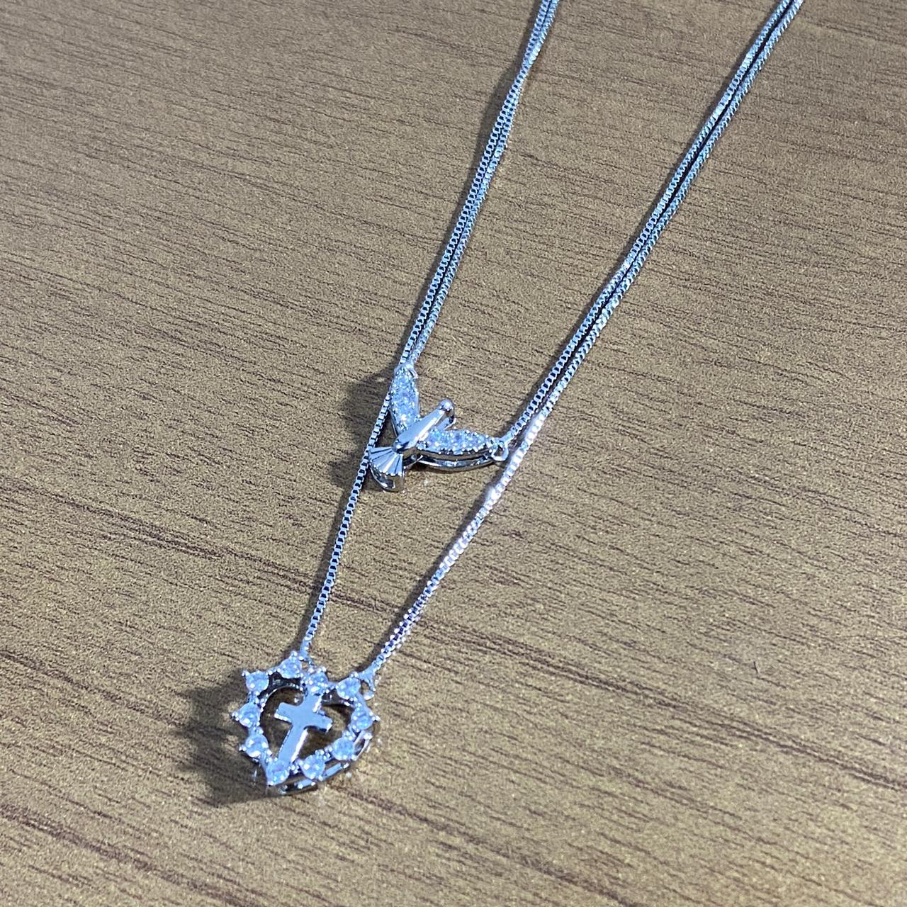 CONJUNTO COLARES PRATEADO DIVINO ESPÍRITO SANTO E CRUZ COM STRASS (1 UNIDADE)