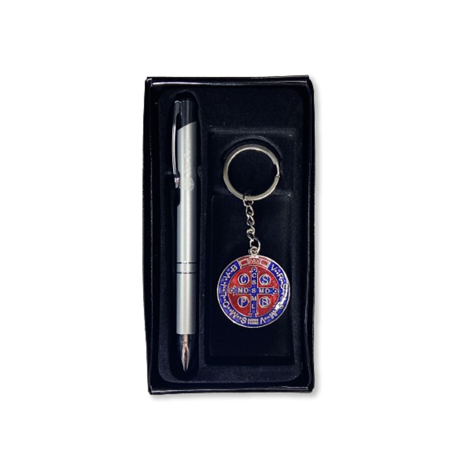 KIT CANETA COM CHAVEIRO MEDALHA SÃO BENTO PRATA ( 1 UNIDADE)