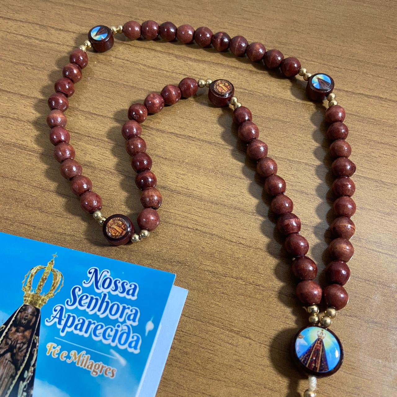 TERÇO DE MADEIRA NOSSA SENHORA APARECIDA E MEDALHA SÃO BENTO 7 MEDALHAS 8MM (3 UNIDADES)