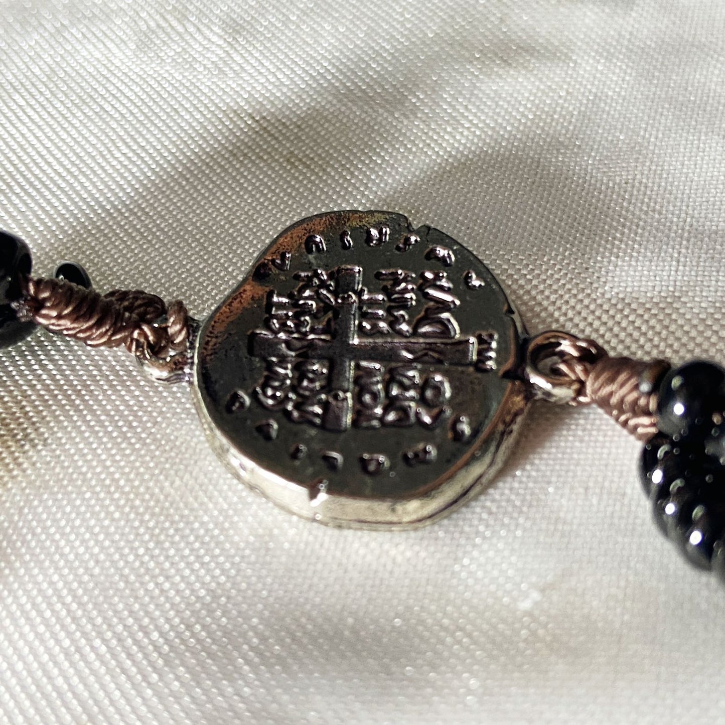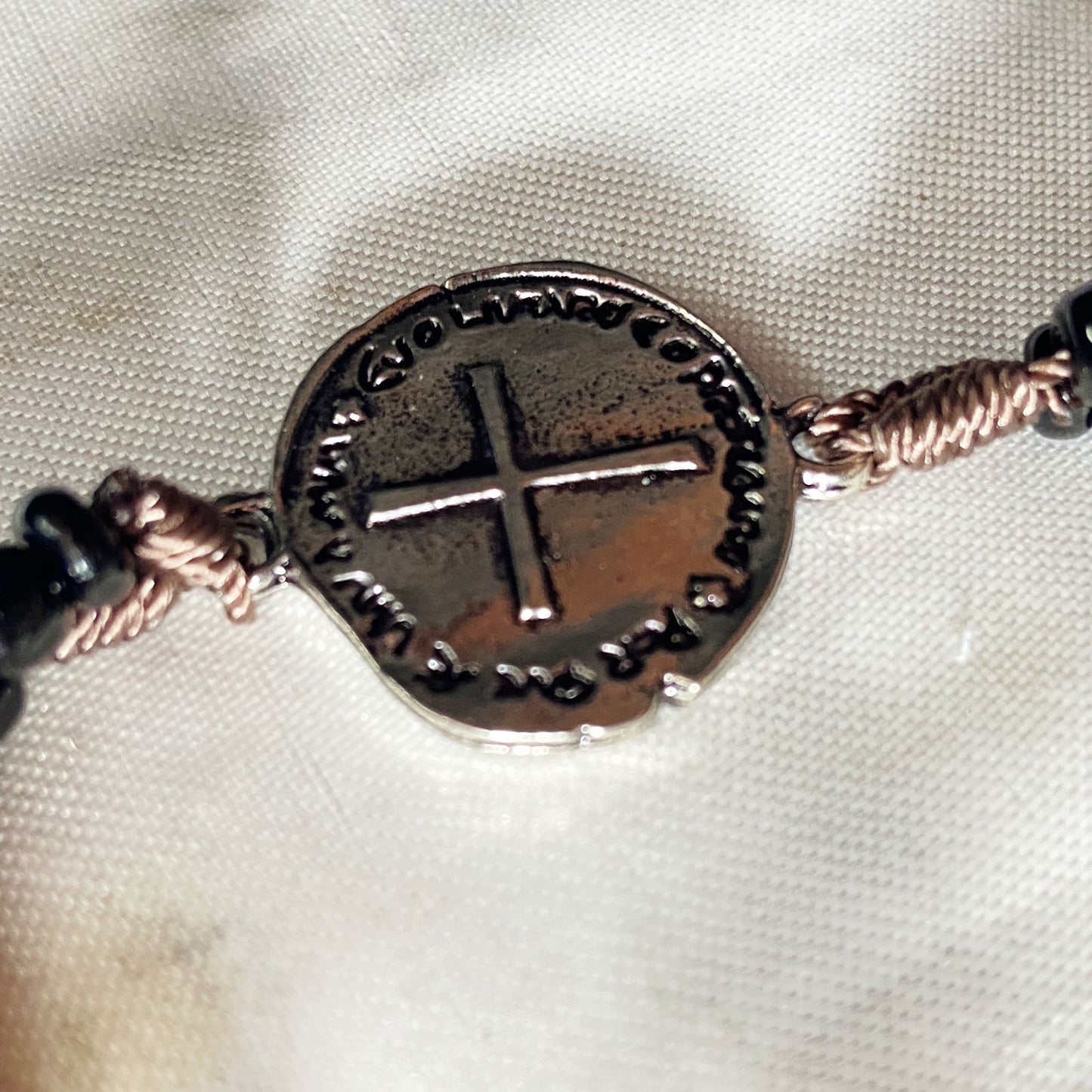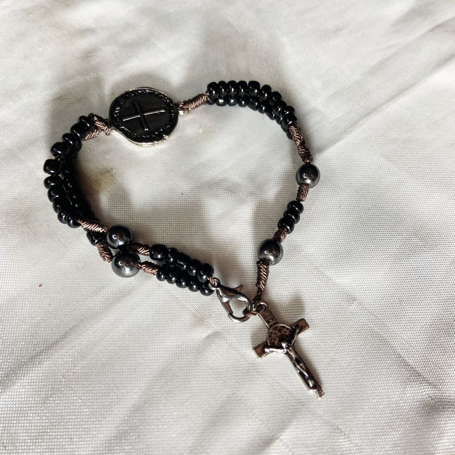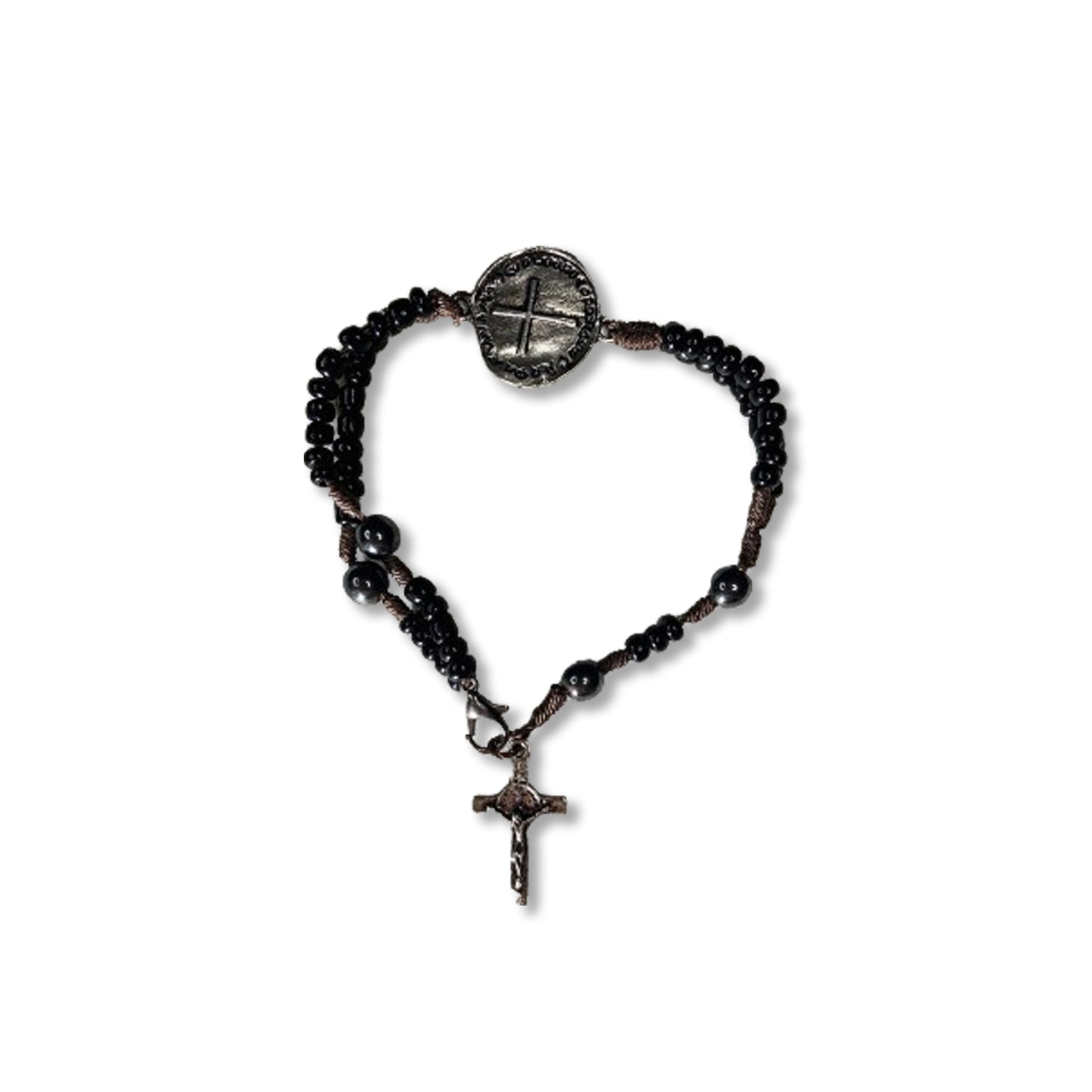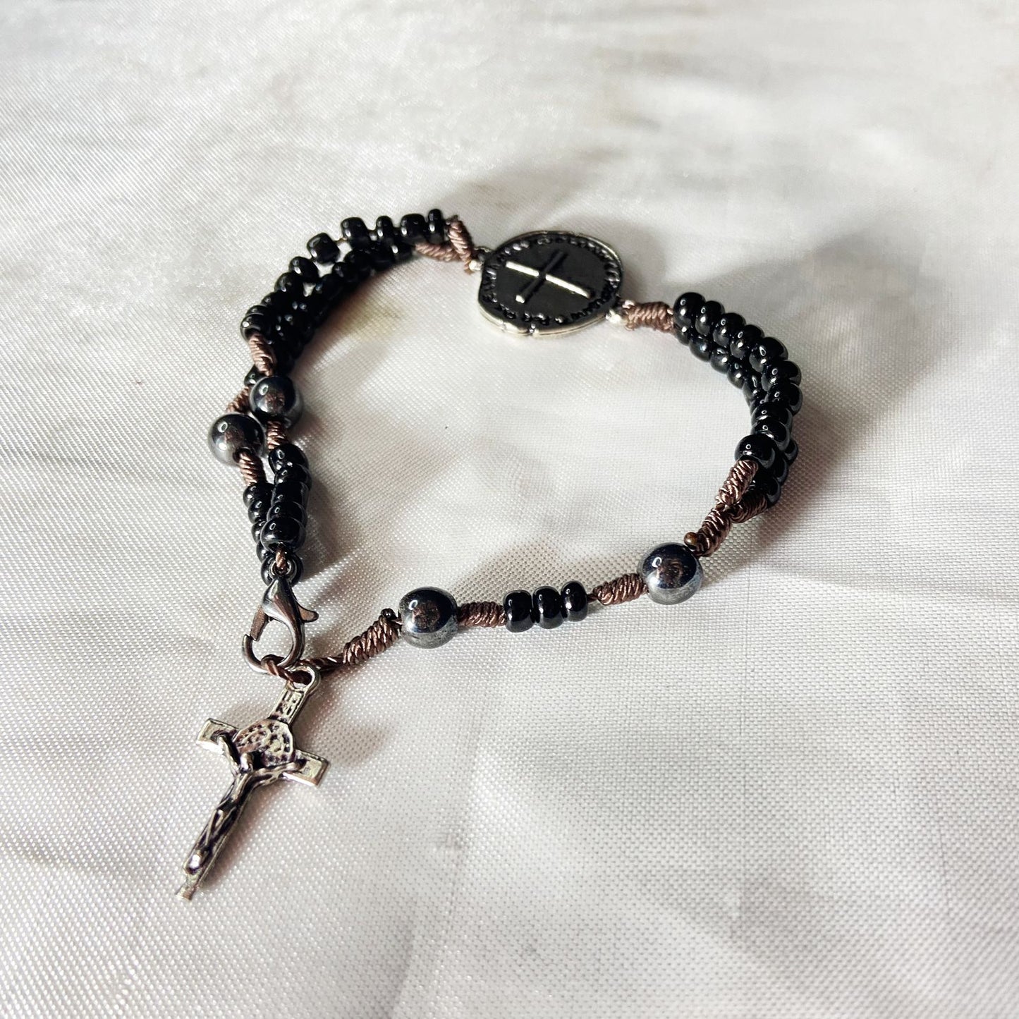 TERÇO PULSEIRA MIÇANGA DUAS MEDALHAS CONTAS DE HEMATITA (6 UNIDADES)